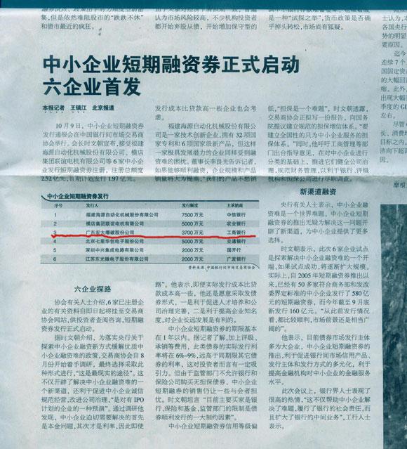 10月9日,中國銀行間市場交易商協(xié)會正式啟動了中小企業(yè)發(fā)行短期融資券試點,我司成為首批發(fā)行短期融資券的6家中小企業(yè)之一,公司從準備申報材料,到獲得注冊通知,僅用了22天時間,預計大約兩周之后,公司就可以拿到發(fā)行短期融資券募集的3700萬元資金,約占公司凈資產(chǎn)的40%。