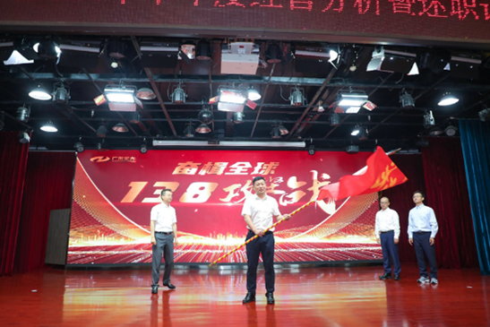 會(huì)議隆重舉行了“奮楫全球·138攻堅(jiān)戰(zhàn)”誓師儀式。鄭炳旭董事長代表董事會(huì)篤定年度目標(biāo),號(hào)召全體宏大人要有“亂云飛渡仍從容”的定力,要有“敢教日月?lián)Q新天”的豪情,要有“咬定青山不放松”的韌勁,要有“直掛云帆濟(jì)滄?!钡钠橇?,迎難而上,開啟新的篇章,贏取更大的勝利。在莊嚴(yán)的授旗儀式上,鄭炳旭董事長將“奮楫全球·138攻堅(jiān)戰(zhàn)”戰(zhàn)旗,鄭重地授予公司輪值總經(jīng)理團(tuán)隊(duì)。輪值總經(jīng)理團(tuán)隊(duì)帶領(lǐng)全體骨干人員共同承諾,堅(jiān)決完成董事會(huì)下達(dá)的全部指標(biāo)任務(wù)。
