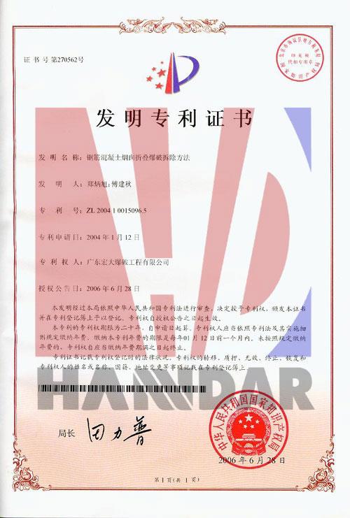 6月28日,國(guó)家知識(shí)產(chǎn)權(quán)局批準(zhǔn)了我司申報(bào)的發(fā)明專利——“鋼筋混凝土煙囪折疊爆破拆除方法”,并頒發(fā)了專利證書(專利號(hào):ZL200410015096.5)。