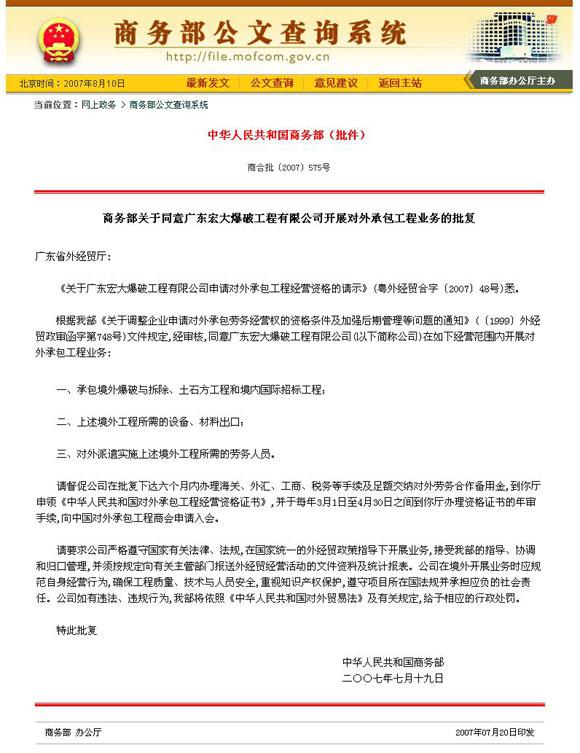 根據(jù)中華人民共和國(guó)商務(wù)部“商合批(2007)575號(hào)”文的批示,同意廣東宏大爆破工程有限公司開(kāi)展對(duì)外承包工程業(yè)務(wù):1、承包境外爆破與拆除、土石方工程和境內(nèi)國(guó)際招標(biāo)工程;2、境外工程所需的設(shè)備、材料出口;3、對(duì)外派駐實(shí)施境外工程所需的勞務(wù)人員。