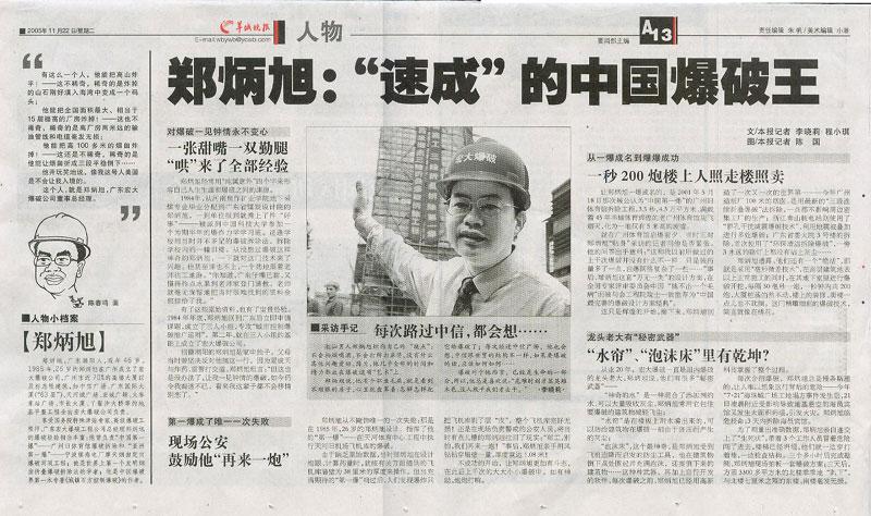 2005年11月21日,羊城晚報記者來我公司對鄭炳旭總經(jīng)理進(jìn)行了人物專訪,并于22日發(fā)表了題為《鄭炳旭:“速成”的中國爆破王》的文章。