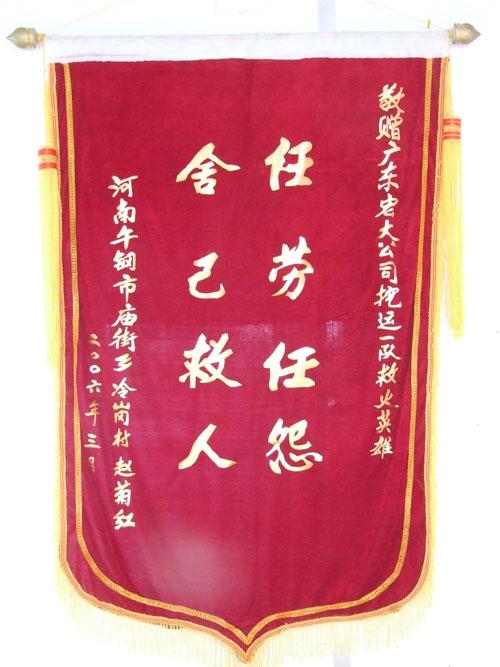 我司在河南省舞鋼市的廣東宏大舞鋼經山寺采礦工程項目部,于三月二十日中午,接受當?shù)卮迕褓浰偷?/span>‘舍己救人、任勞任怨’錦旗一面,該錦旗是當?shù)卮迕駷榱吮碚梦宜咎锸a堂、向華朝等同志在二月二十五日晚帶領、組織項目部職工為當?shù)卮迕駬岆U救火的舍身行為。 田蔭堂、向華朝等同志為我司在河南樹立了良好的企業(yè)形象,為了表彰他們這種大無畏舍身救火的英勇行為,同時也希望出現(xiàn)更多的好人好事,公司項目部對田蔭堂、向華朝等同志在項目部范圍內進行了通報表揚。