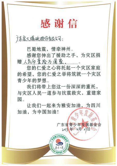 公司在此次賑災(zāi)義演中捐贈10萬元,宏大公司黨委副書記關(guān)秀云代表我公司出席了賑災(zāi)義演活動,并表示公司將會持續(xù)關(guān)注災(zāi)情發(fā)展,履行公眾公司的社會責(zé)任,努力為災(zāi)區(qū)的重建工作做出貢獻(xiàn)。