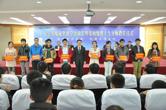 2013年4月11日下午, 安徽理工大學(xué)宏大爆破獎助學(xué)金頒發(fā)暨鄭炳旭博士生導(dǎo)師聘任儀式在安徽理工大學(xué)(以下簡稱安理工)新教學(xué)樓九樓報告廳隆重舉行。安理工校長顏事龍、廣東宏大爆破股份有限公司(以下簡稱宏大爆破)董事長鄭炳旭、校領(lǐng)導(dǎo)葉醒獅、王其東、宏大爆破人力資源總監(jiān)符益群以及學(xué)校相關(guān)師生共計400余人參加了本次表彰大會。共有115名(本科生、碩士生)學(xué)生獲得本次獎助學(xué)金并獲現(xiàn)場頒獎。
