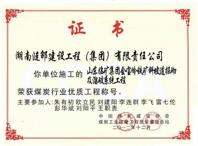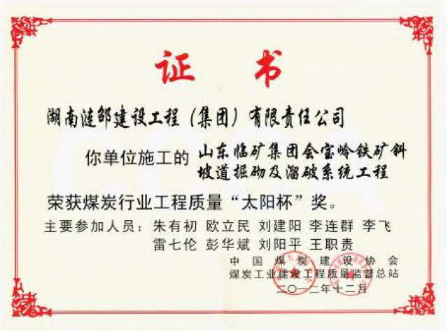 漣邵建工集團(tuán)承建的山東臨礦集團(tuán)會寶嶺鐵礦斜坡道掘砌及溜破系統(tǒng)工程喜獲煤炭行業(yè)“優(yōu)質(zhì)工程”稱號,并獲煤炭行業(yè)工程最高質(zhì)量獎“太陽杯”獎。