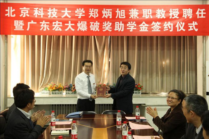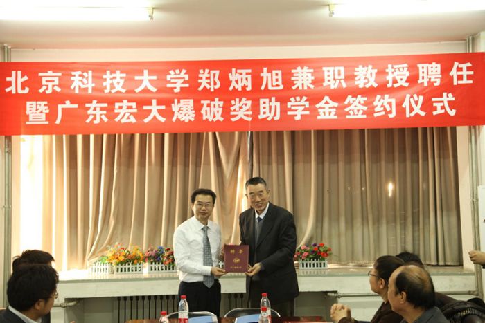 鄭教授在儀式上對北科大聘他為兼職教授表示衷心感謝,鄭教授說:這不僅是他個人的榮譽,也是整個宏大公司的榮譽。今后,他愿為北科大的發(fā)展貢獻自己的綿薄之力,宏大公司也將繼續(xù)履行上市公司的社會責任,繼續(xù)與北京科技大學在課題研究、人才培養(yǎng)、推進科技進步等方面進行深入的合作。
