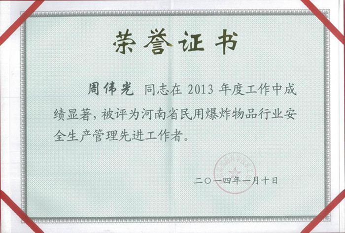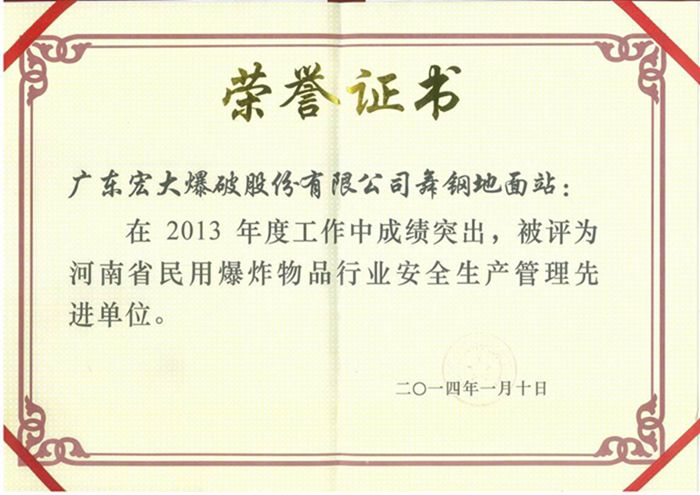 1月13日,在河南省國防科學(xué)技術(shù)工業(yè)局主持召開的2014年全省民用爆炸物品行業(yè)安全生產(chǎn)工作會議上,我公司河南舞鋼地面站獲得2013年度“河南省民用爆炸物品行業(yè)安全生產(chǎn)管理先進單位”稱號,其中周偉光同志被評為2013年度“河南省民用爆炸物品行業(yè)安全生產(chǎn)管理先進工作者”。