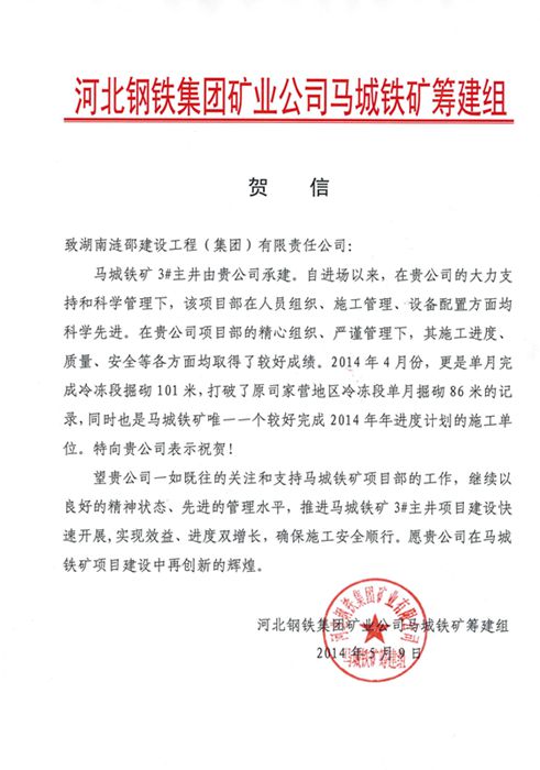 5月9日,河北鋼鐵集團(tuán)礦業(yè)公司馬城鐵礦籌建組向廣東宏大爆破股份有限公司控股公司:湖南漣邵建設(shè)工程(集團(tuán))有限責(zé)任公司(以下簡(jiǎn)稱:漣邵建工)發(fā)來賀信,漣邵建工在承建馬城鐵礦3#主井施工中,進(jìn)度、質(zhì)量、安全均取得較好成績(jī),在4月份完成單月冷凍段掘砌101米,打破了業(yè)主方其他立井冷凍段單月掘砌86米的記錄。