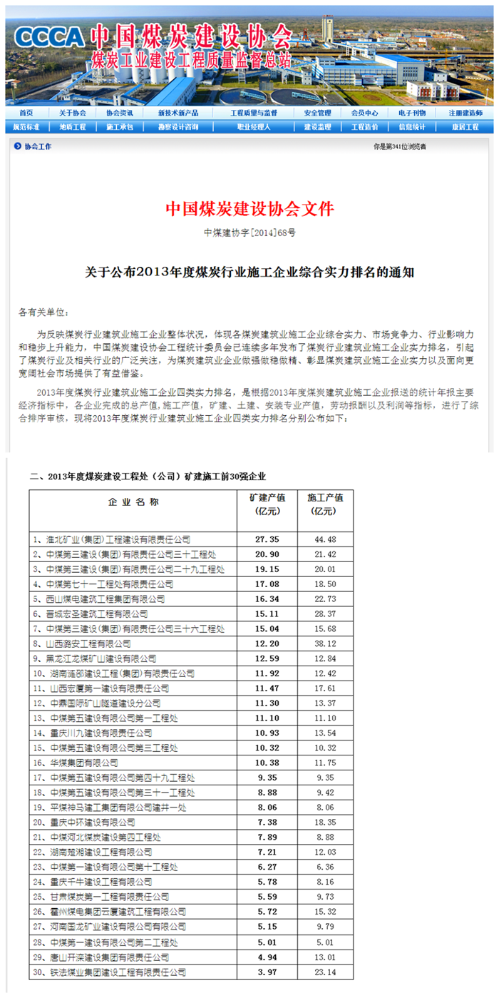 為了反映煤炭行業(yè)建筑業(yè)施工企業(yè)整體狀況,體現(xiàn)各煤炭建筑業(yè)施工企業(yè)綜合實力、市場競爭力、行業(yè)影響力和穩(wěn)步上升能力,中國煤炭建設(shè)協(xié)會工程統(tǒng)計委員會已連續(xù)多年發(fā)布了煤炭行業(yè)建筑業(yè)施工企業(yè)實力排名,引起了煤炭行業(yè)及相關(guān)行業(yè)的廣泛關(guān)注。2013年度煤炭行業(yè)建筑業(yè)施工企業(yè)三類(礦建、土建、安裝)實力排名是根據(jù)2013年度各企業(yè)完成的總產(chǎn)值,施工產(chǎn)值,礦建、土建、安裝專業(yè)產(chǎn)值,勞動報酬以及利潤等指標,進行綜合排序?qū)徍说慕Y(jié)果,較為客觀地反映了全國煤炭建筑業(yè)施工企業(yè)的整體實力和專業(yè)實力。