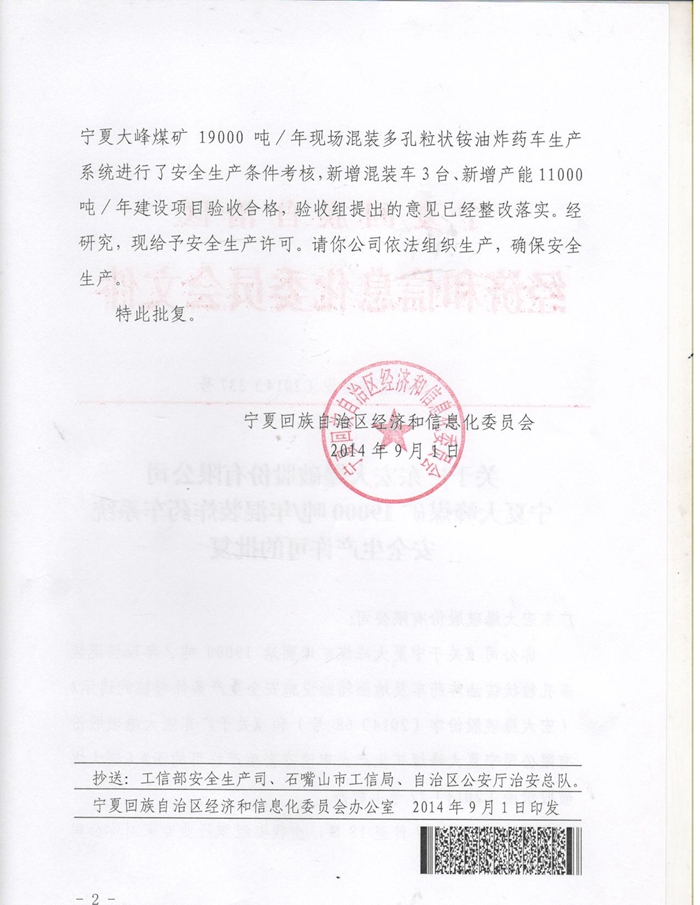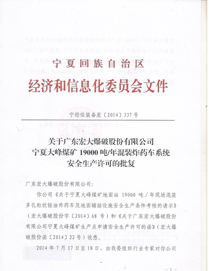 9月1日,廣東宏大爆破股份有限公司收到寧夏回族自治區(qū)經(jīng)濟(jì)和信息化委員會(huì)印發(fā)的《關(guān)于廣東宏大爆破股份有限公司寧夏大峰煤礦19000噸/年混裝炸藥車系統(tǒng)安全生產(chǎn)許可的批復(fù)》。批復(fù)文件內(nèi)容顯示:寧夏大峰煤礦19000噸/年現(xiàn)場(chǎng)混裝多孔粒狀銨油炸藥車生產(chǎn)系統(tǒng)通過(guò)安全生產(chǎn)條件考核,新增混裝車3臺(tái),新增產(chǎn)能11000噸/年,建設(shè)項(xiàng)目驗(yàn)收合格,驗(yàn)收組提出的問(wèn)題已經(jīng)整改落實(shí),經(jīng)研究,現(xiàn)給予安全生產(chǎn)許可。