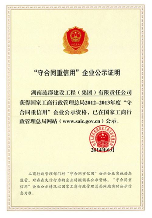 近日,廣東宏大爆破股份有限公司控股子公司:湖南漣邵建設(shè)工程(集團)有限公司(以下簡稱:漣邵建工)從婁底市工商行政管理局領(lǐng)回了,由國家工商行政管理總局頒發(fā)的2012-2013年度“守合同重信用”企業(yè)公示證明。至此,漣邵建工已經(jīng)連續(xù)兩次獲此殊榮。