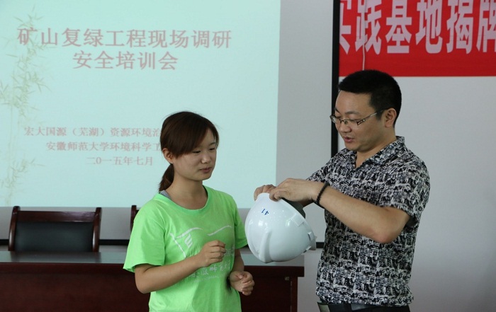 儀式結(jié)束后,宏大國源副總經(jīng)理?xiàng)罴腋?,向同學(xué)們詳細(xì)介紹了繁昌縣礦山復(fù)綠工程現(xiàn)狀以及“繁昌模式”的基本情況。隨后,為保障調(diào)研活動(dòng)安全平穩(wěn)進(jìn)行,宏大國源安環(huán)部經(jīng)理薛國平向同學(xué)們做了詳細(xì)的安全培訓(xùn)。