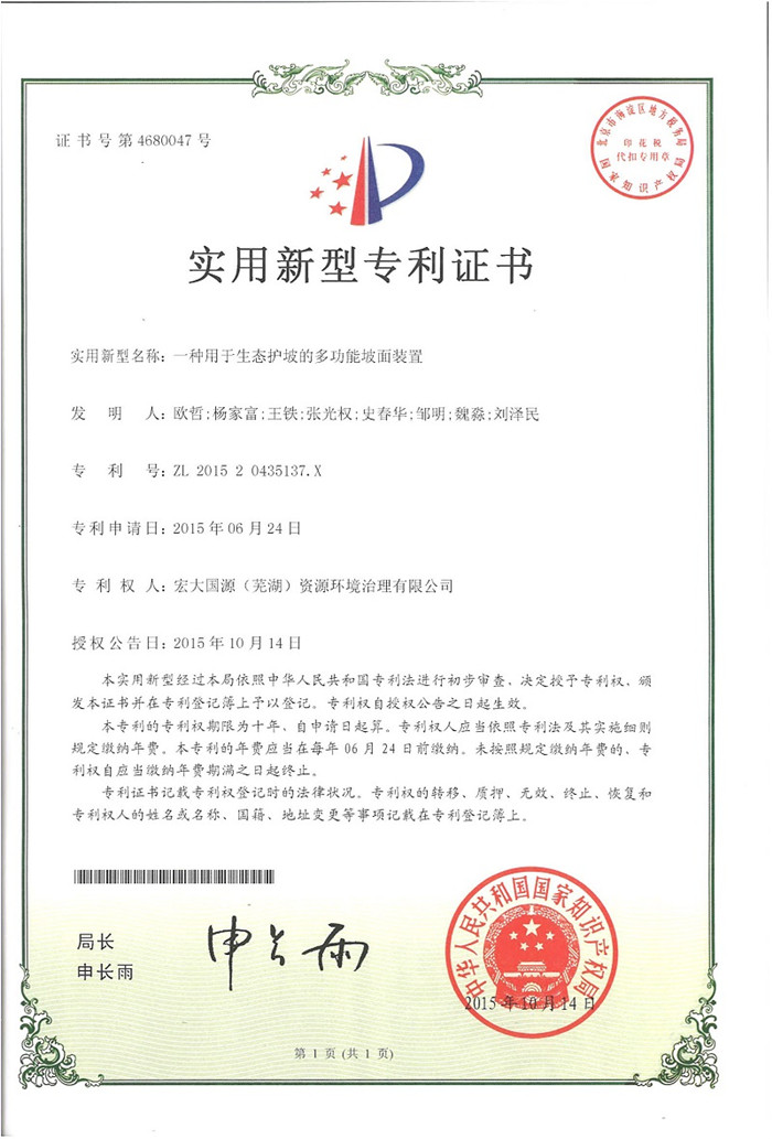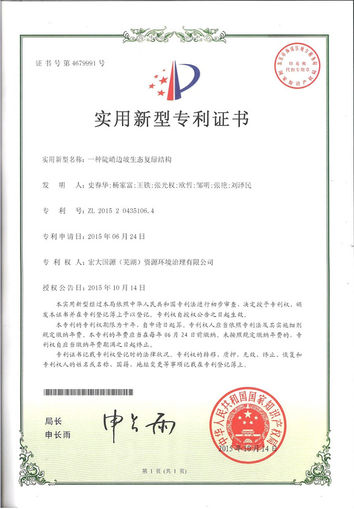 近日,廣東宏大爆破股份有限公司控股子公司:宏大國(guó)源(蕪湖)資源環(huán)境治理有限公司(以下簡(jiǎn)稱:宏大國(guó)源)又傳喜訊:“一種可升降的半自動(dòng)坡面攔石裝置” 獲得發(fā)明專利; “一種陡峭邊坡生態(tài)復(fù)綠結(jié)構(gòu)”和“一種用于生態(tài)護(hù)坡的多功能坡面裝置”
