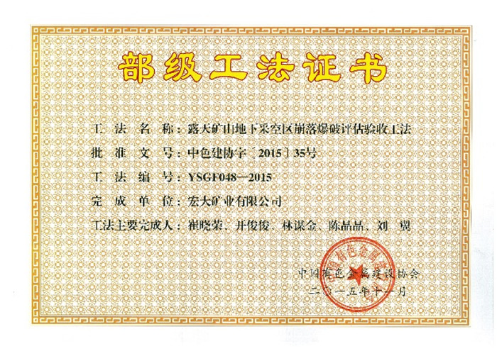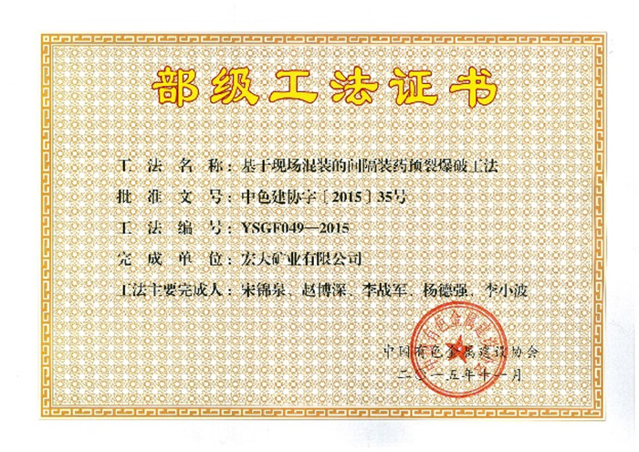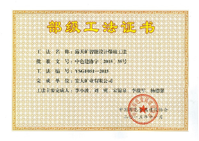 廣東宏大爆破股份有限公司全資子公司:宏大礦業(yè)有限公司申報(bào)的《地采轉(zhuǎn)露采礦山采空區(qū)空區(qū)治理隱患資源開采協(xié)同作業(yè)工法》、《高寒地區(qū)露天采礦工法》、《高溫火區(qū)全孔蓄水爆破工法》、《露天礦智能設(shè)計(jì)爆破工法》、《基于現(xiàn)場(chǎng)混裝的間隔裝藥預(yù)裂爆破工法》、《露天礦山地下采空區(qū)崩落爆破評(píng)估驗(yàn)收工法》六項(xiàng)工法順利通過中國有色金屬建設(shè)協(xié)會(huì)專家評(píng)審,并于近日獲得證書。