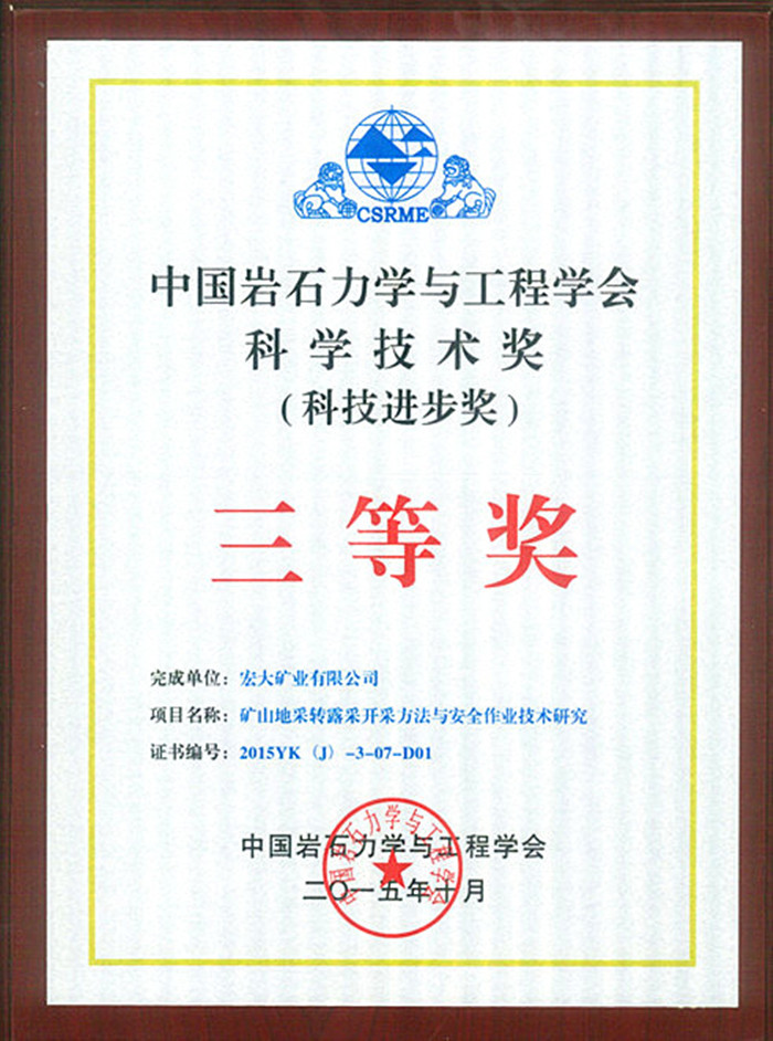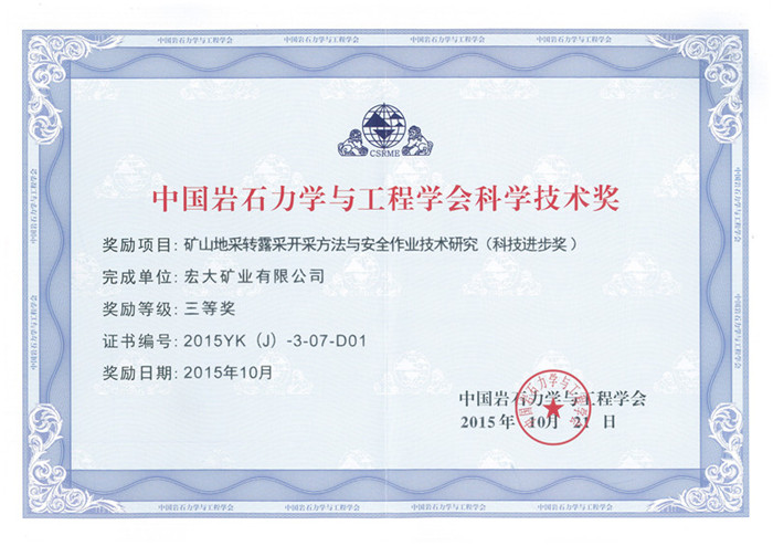 中國巖石力學與工程學會科學技術獎是經中華人民共和國科學技術部批準設立的,專門獎勵在巖石力學與工程中做出突出貢獻的科技人員和單位。此榮譽的獲得是我公司全體員工共同努力的成果,也是我公司技術實力的象征,為一線的安全生產提供了技術保證。不僅如此,此獎項的獲得,對公司核心競爭力的提升、未來高新技術企業(yè)申請、對外項目拓展等工作都具有重大意義。