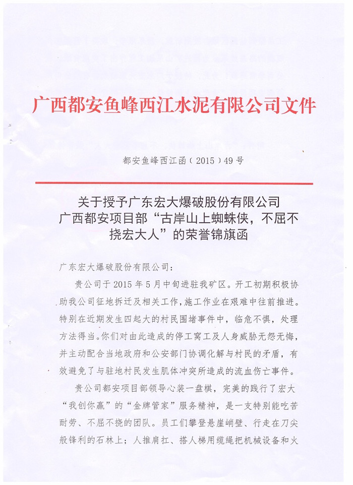 12月24日一早,廣西都安魚峰西江水泥有限公司廖承立經(jīng)理在宏大礦業(yè)有限公司下屬廣西都安項目部駐地授予宏大礦業(yè)廣西都安項目部“古岸山上的蜘蛛俠,不屈不撓的宏大人”榮譽(yù)錦旗。