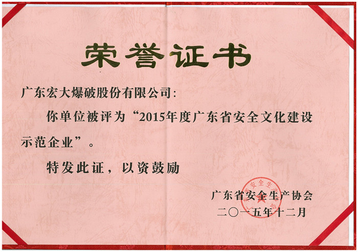 近日,廣東宏大爆破股份有限公司收到廣東省安全生產(chǎn)協(xié)會下發(fā)的《關(guān)于命名2015年廣東省安全文化建設(shè)示范企業(yè)的通知》。廣東宏大爆破股份有限公司喜獲“廣東省安全文化建設(shè)示范企業(yè)”稱號,是17家受命名單位之一,在同行業(yè)中,宏大爆破是唯一一家。