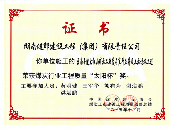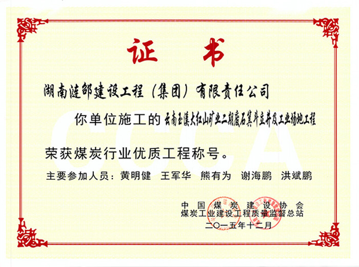 4月8日, 全國“煤炭施工企業(yè)轉(zhuǎn)型發(fā)展交流座談會暨煤炭建設(shè)行業(yè)創(chuàng)先爭優(yōu)表彰會”在重慶市隆重召開。廣東宏大爆破股份有限公司控股子公司:湖南漣邵建設(shè)工程(集團)有限責任公司(以下簡稱:漣卲建工)承建施工的“云南玉溪大紅山礦業(yè)二期廢石箕斗立井及工業(yè)場地工程”榮獲煤炭行業(yè)最高質(zhì)量獎項--“太陽杯”獎,這也是公司近5年來第三次獲得全煤行業(yè)建設(shè)質(zhì)量最高獎項。