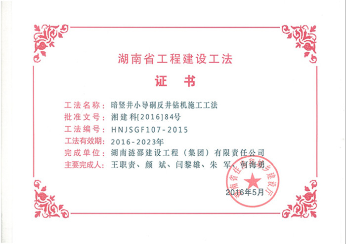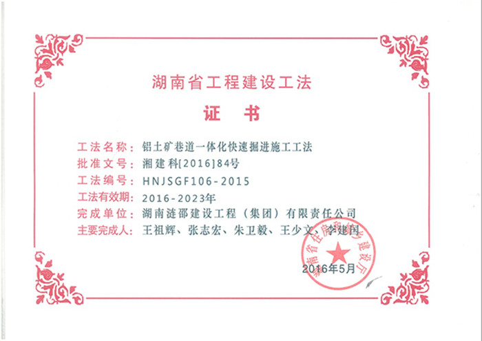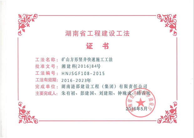 近日,湖南省住房和城鄉(xiāng)建設(shè)廳下發(fā)了《關(guān)于公布2015年度工程建設(shè)省級(jí)工法名單的通知》,漣邵建工申報(bào)的《鋁土礦巷道一體化快速掘進(jìn)施工工法》、《暗豎井小導(dǎo)硐反井鉆機(jī)施工工法》、《礦山方形豎井快速施工工法》三部工法,審定為2015年度工程建設(shè)省級(jí)工法。