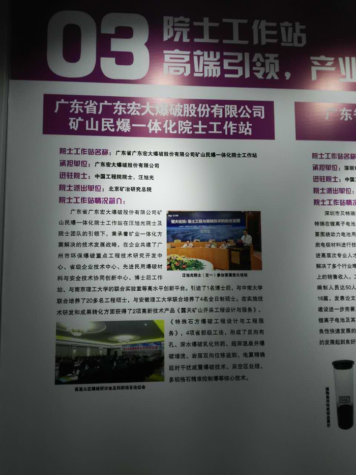 宏大爆破“礦山民爆一體化院士工作站”,于2014年經(jīng)廣東省科技廳批準立項并資助100萬元。目前,廣東省共資助建設院士工作站121家,主要涉及先進制造、高端裝備、新材料、電子信息、生物醫(yī)藥等領域。本次會展,省科技廳從121家院士工作站中選拔出10家參展,大多數(shù)屬于新興行業(yè),宏大爆破院士工作站是唯一一家傳統(tǒng)行業(yè)企業(yè),顯得彌足珍貴。