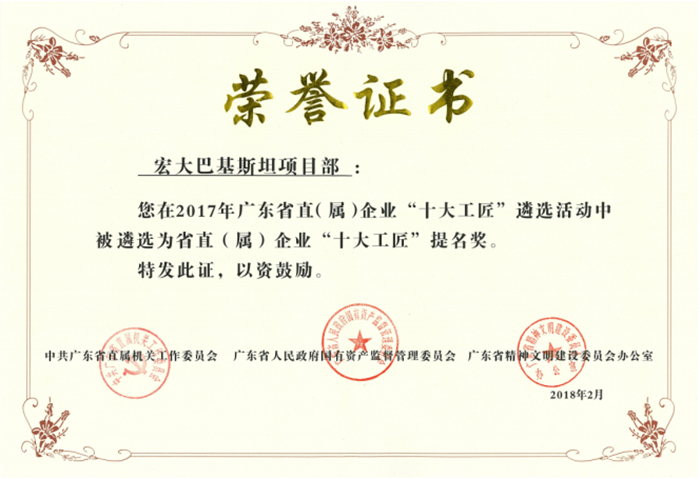 2月11日,在由省直機(jī)關(guān)工委、省國資委、省文明辦聯(lián)合舉辦的“省直(屬)企業(yè)‘十大工匠’”遴選活動(dòng)中,宏大爆破有限公司巴基斯坦塔爾煤田項(xiàng)目部榮獲提名獎(jiǎng)。
