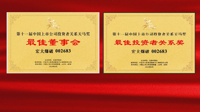 5月13日,由證券時(shí)報(bào)主辦的“第十一屆中國(guó)上市公司投資者關(guān)系天馬獎(jiǎng)”評(píng)選揭曉了本屆獲獎(jiǎng)名單。宏大爆破憑借優(yōu)秀的公司治理、卓越的董事會(huì)建設(shè)和優(yōu)秀的投資者關(guān)系管理,榮膺“最佳董事會(huì)”和“最佳投資者關(guān)系”兩項(xiàng)大獎(jiǎng)。