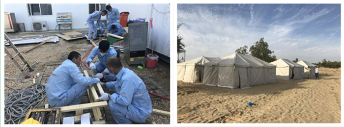 由于疫情影響,人員調(diào)動和物資采購極為困難,項目部發(fā)動員工做好營區(qū)場平,動手改裝集裝箱做廚房、搭建帳篷,親手制作餐桌等家具。