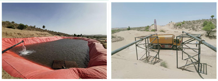 臨建設(shè)施陸續(xù)建立,人員、設(shè)備、物資終于可以入場,項目部開始正常施工。沒想到,又遇到了沙地陷車、沙塵暴、道路維護缺水等困難。于是,大家想出了好辦法,自己搭建搭建自流加水站,解決現(xiàn)場道路維護缺水問題。