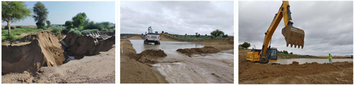 二季度抗旱,三季度抗洪。雨季來臨,沙漠中雨勢匆匆且磅礴,極易沖毀邊坡、道路。項目部提前制定好抗洪搶險預(yù)案,實時關(guān)注天氣變化,挖好防洪溝,修筑好防洪擋墻。通過“小水堵,大水疏”等方式,保護好現(xiàn)場運輸?shù)缆芳斑吰?。在雨季停工期間,還完善了巴方營區(qū)、現(xiàn)場辦公室、排場休息亭等臨時設(shè)施,為后續(xù)增產(chǎn)打下了基礎(chǔ)。